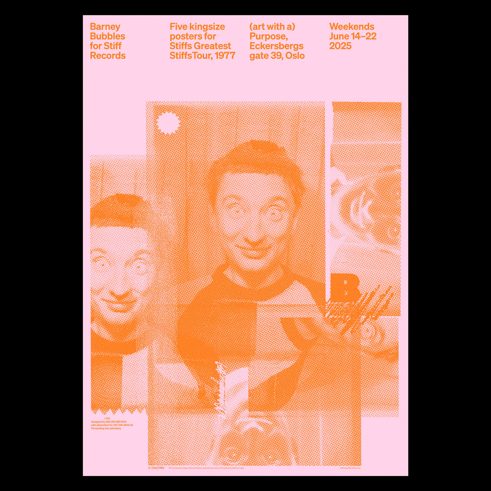A1 poster promoting an exhibition showing five big posters Barney Bubbles designed for the Stiff Records tour of 1977.